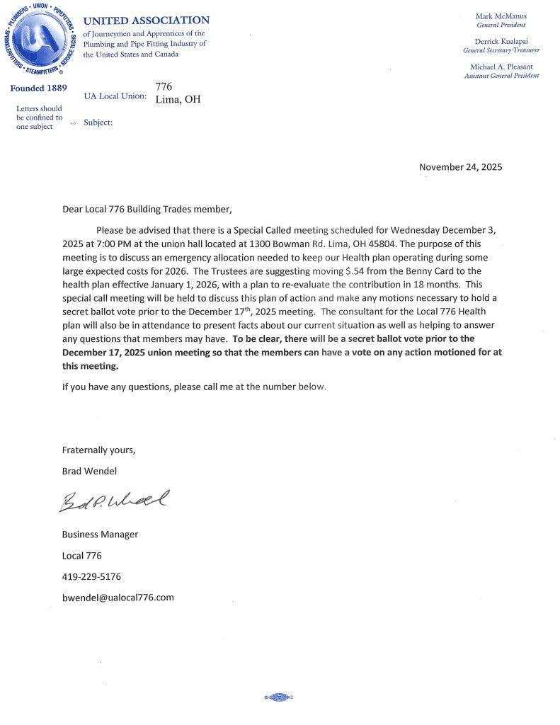 Recently I have sent a flyer to all active members in the local about a special call meeting scheduled for December 3, 2025. If you received one of these flyers, I encourage you to attend. Our Health plan is continuing to suffer financially due to excessively high claims and we need to make a change to help get this plan moving in the right direction. Please come out for open discussion and if you have an idea that may help, this would be the place to present it. We will have the H&W plan consultant on hand to help answer any questions and also present some expected costs for the upcoming plan year. This is not easy for anyone to deal with, but at the end of the day, we need to step up and protect the health plan that has been good to us for so many years.